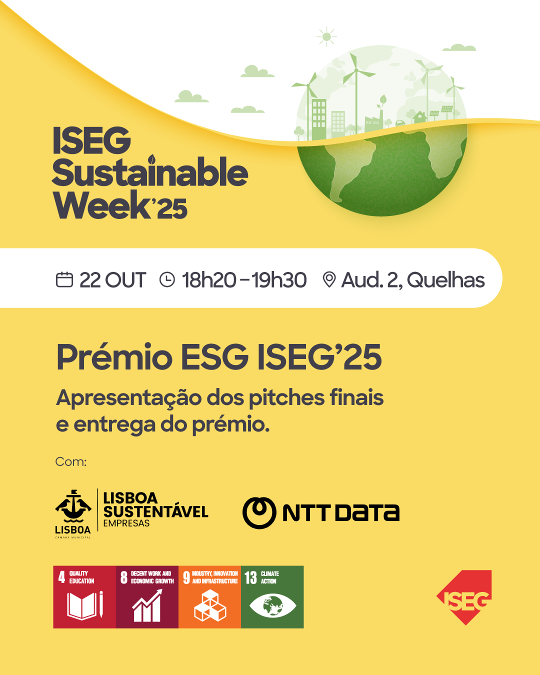 No âmbito do Prémio ISEG_ESG 2025, promovido pelo Lisboa Sustentável Empresas, ISEG e NTT DATA, no dia 22 de outubro serão apresentados os pitches finais e realizada a cerimónia de entrega do prémio à melhor tese de mestrado sobre a temática: "Como apoiar as empresas a implementarem uma gestão mais sustentável ESG, que maximize a sua resiliência e promova uma cidade mais sustentável".