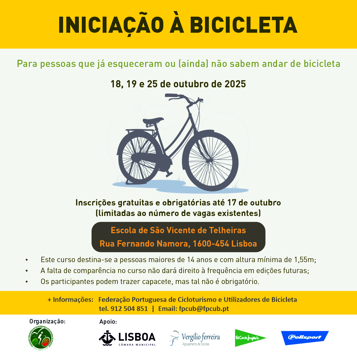 A Federação Portuguesa de Cicloturismo e Utilizadores de Bicicleta, com o apoio da CML/DIPM, promove esta formação para incentivar a mobilidade ativa e contribuir para a redução das emissões de carbono. Porque pedalar é um passo sustentável — e quem não sabe, vai sempre a tempo de aprender!
