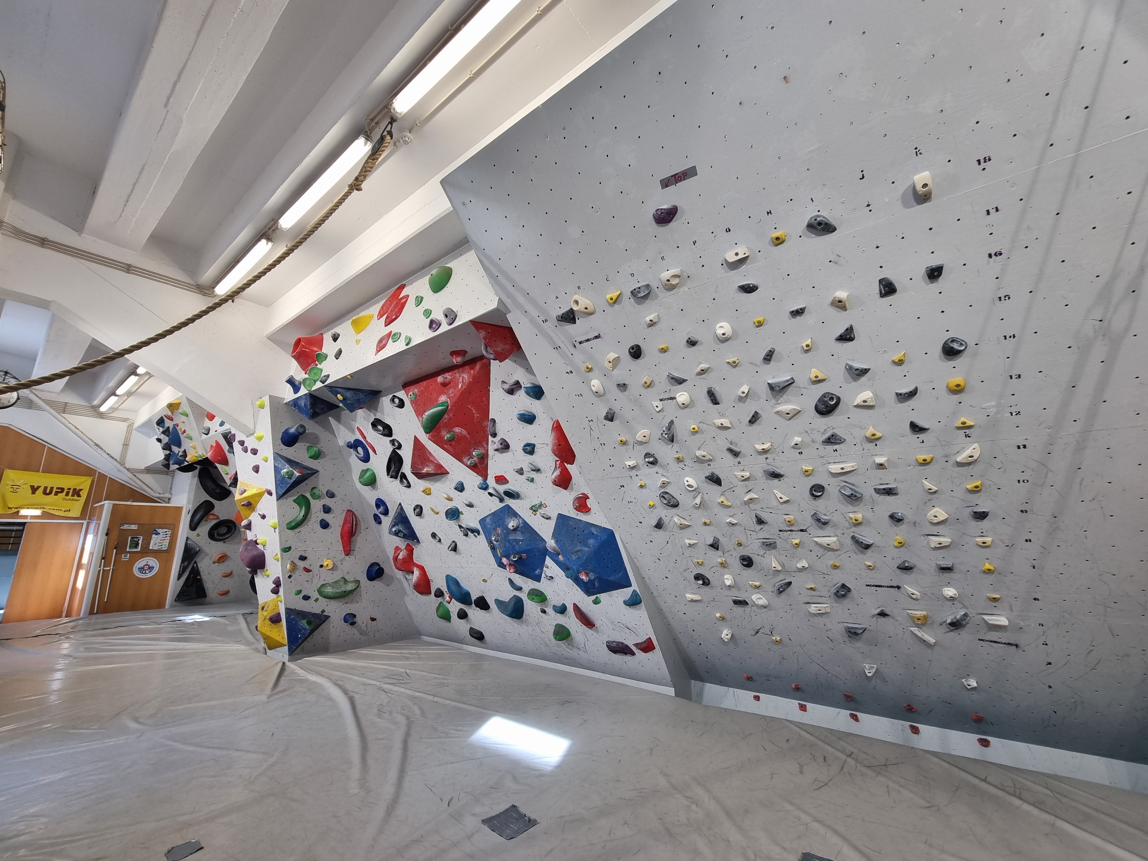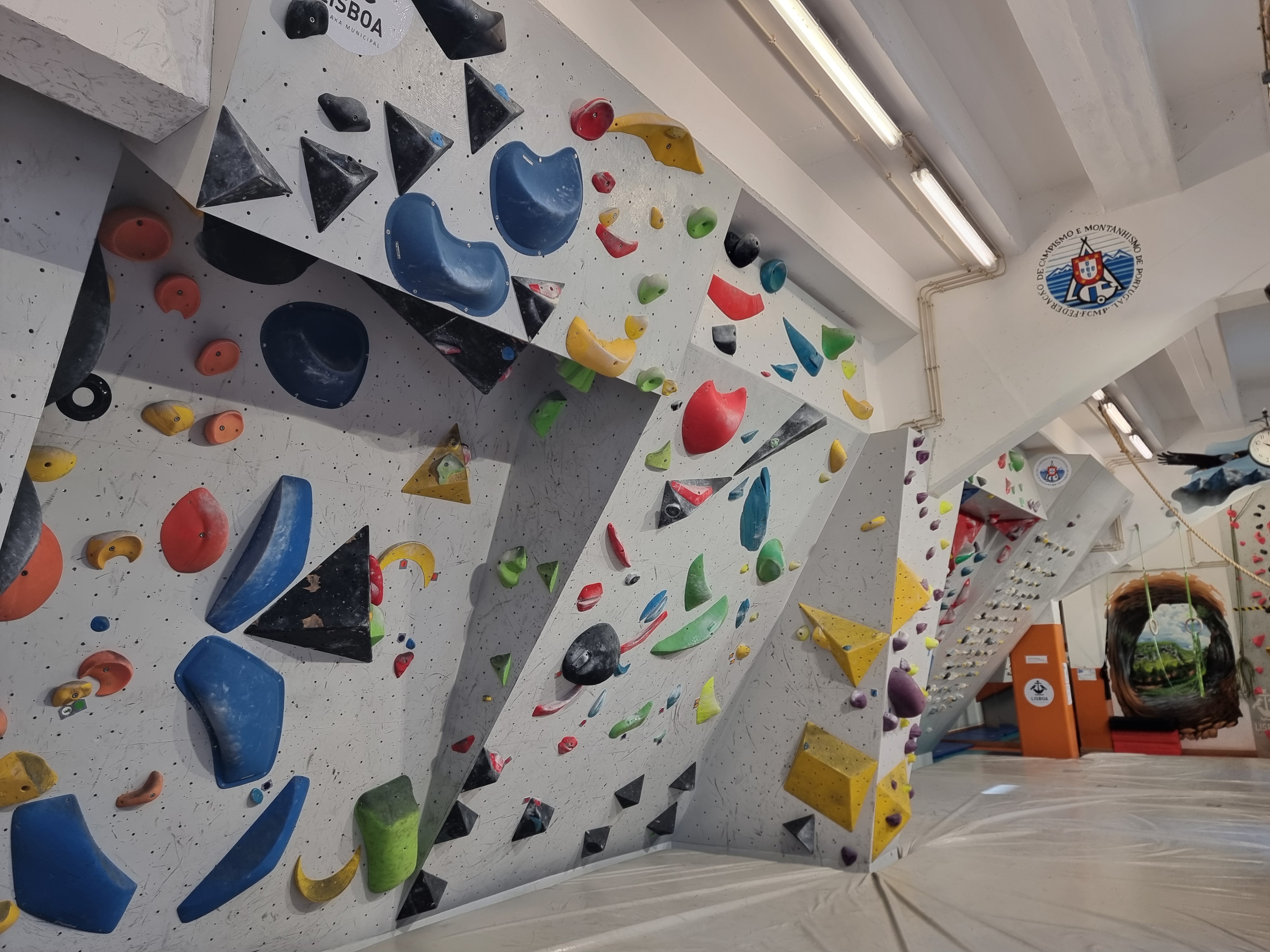 Tem zona de escalada de extra prumo, placas verticais e colchões em todo o piso da sala, de modo a permitir a prática da modalidade em segurança.