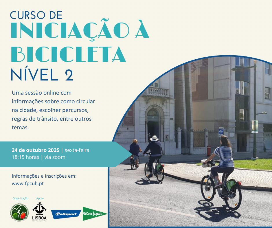 Depois de aprender a pedalar, é hora de ganhar confiança para circular na cidade! A Federação Portuguesa de Cicloturismo e Utilizadores de Bicicleta, com o apoio da CML/DIPM, promove uma sessão teórica online (via Zoom) no âmbito do Curso de Iniciação à Bicicleta — Nível 2, no dia 24 de outubro (sexta-feira), às 18h15. Destinada a quem já sabe pedalar, esta formação oferece ferramentas essenciais para adotar a bicicleta como meio de transporte urbano, com temas como: Regras de circulação Equipamento e manutenção básica Planeamento de percursos Dicas para pedalar no trânsito 📌 Inscrições gratuitas AQUI! Ajude a divulgar e contribua para uma Lisboa mais sustentável!